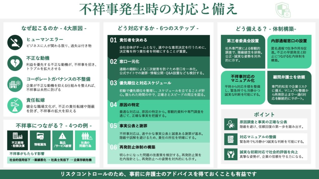 トラブルを抑止できるよう、平時から不祥事の対処法をよく理解し、速やかに実行できるようにしておきましょう。
