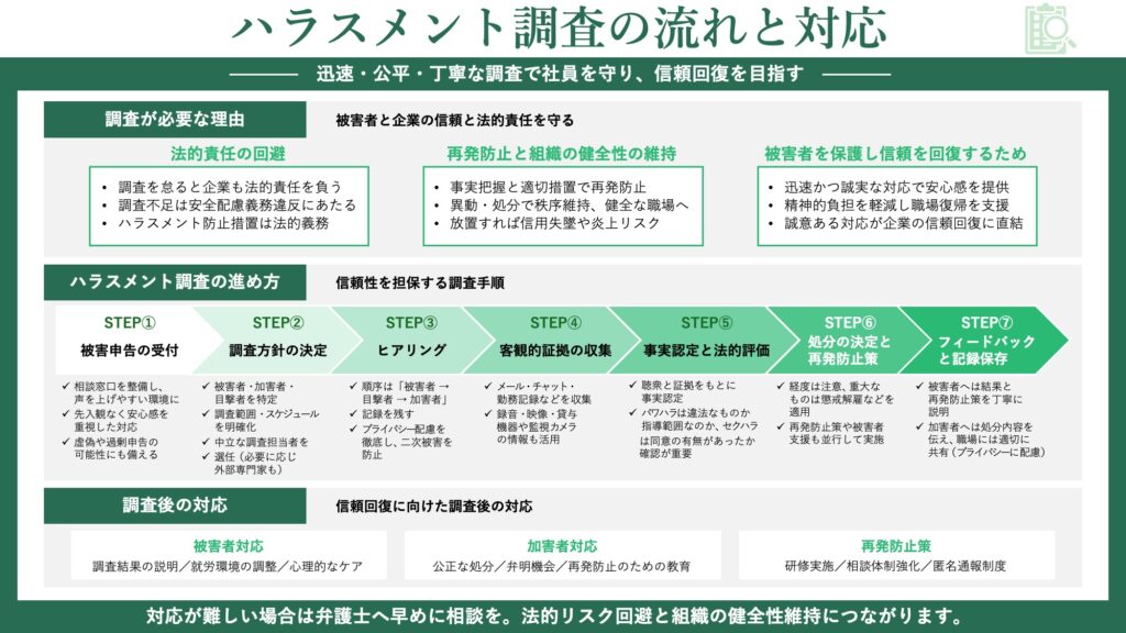 ハラスメントの調査は、事実を明らかにすることがゴールではありません。むしろ、調査後の対応こそが、被害者の救済、職場環境の改善や再発防止、企業の信頼回復になります。
