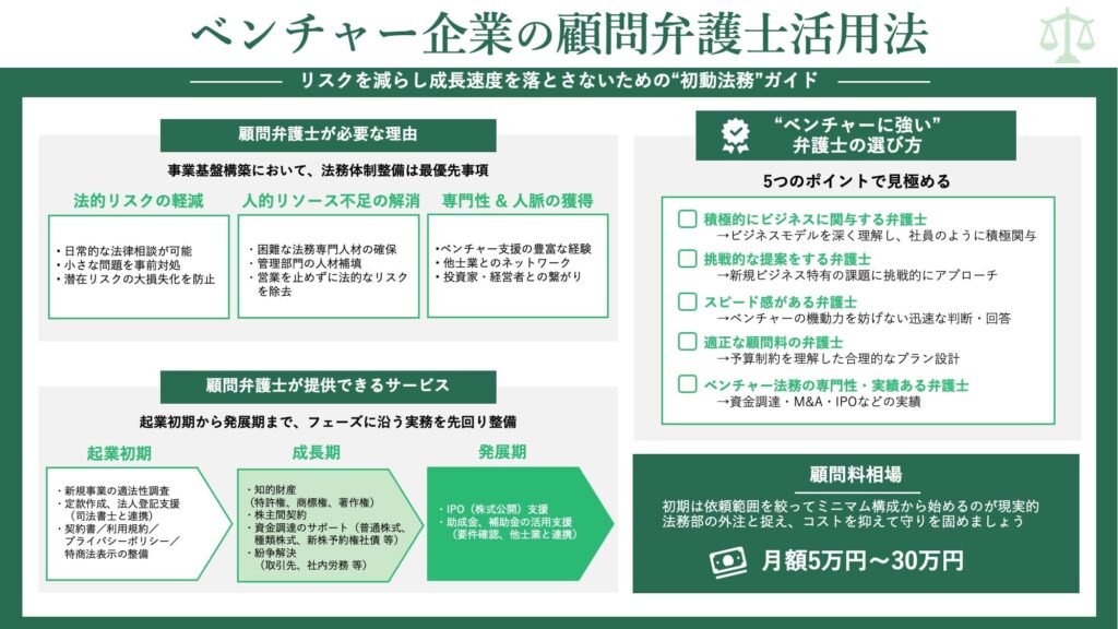 ベンチャー企業が顧問弁護士を選ぶ際は、ベンチャー法務の専門性と実績が重要です。